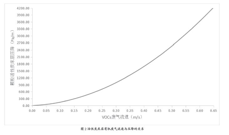 式(1)中:△P為單位活性炭床層高度壓降,單位為帕斯卡每米(Pa/m);υ為有機廢氣流速,單位為米每秒(m/s)。