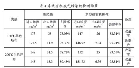 該文所提出的紡織印染定型機有機廢氣凈化處理技術工藝,即在原定型有機廢氣濕式靜電處理系統(tǒng)的基礎上進行技術改造,新增加了活性炭吸附、再生處理和催化氧化裝置系統(tǒng),VOCs總的脫除效率達到95%以上。通過現(xiàn)場實際檢測顆粒物除效率為93.3%和89.45%,VOCs總的脫除效率為95.21%和95.81%。