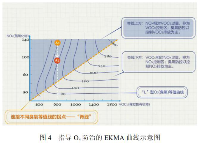 O3生成不僅與前體物VOCs、NOx排放量有關,同時與兩者的比例密切相關,呈現復雜的非線性響應關系。經典的EKMA曲線可用于揭示VOCs和NOx生成O3的復雜關系[3](見圖4),在VOCs和NOx為坐標軸的圖上,O3等值曲線是一條條近似等高線的“L”型曲線,連接不同O3等值線的拐點可以形成一條“脊線”,在脊線上方,NOx相對VOCs過量,稱為VOCs控制區—O3防控以控制VOCs排放為主;在脊線下方,VOCs相對NOx過量,稱為NOx控制區—O3防控以控制NOx為主。在VOCs控制區,VOCs排放保持不變,減排NOx,O3濃度有可能上升。相關研究表明,我國O3污染重點區域總體上為VOCs與NOx協同控制區,但多數市區為VOCs控制區,主要受烯烴、芳香烴和醛類的控制。因此,“十四五”期間O3控制應強調VOCs和NOx協同減排,特別是應加大VOCs的減排力度。