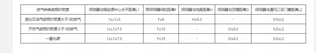 一、當安裝可燃氣體探測器的場所為長方形狀且橫截面積小于4㎡時,相鄰探測器安裝間距不應大于20m。